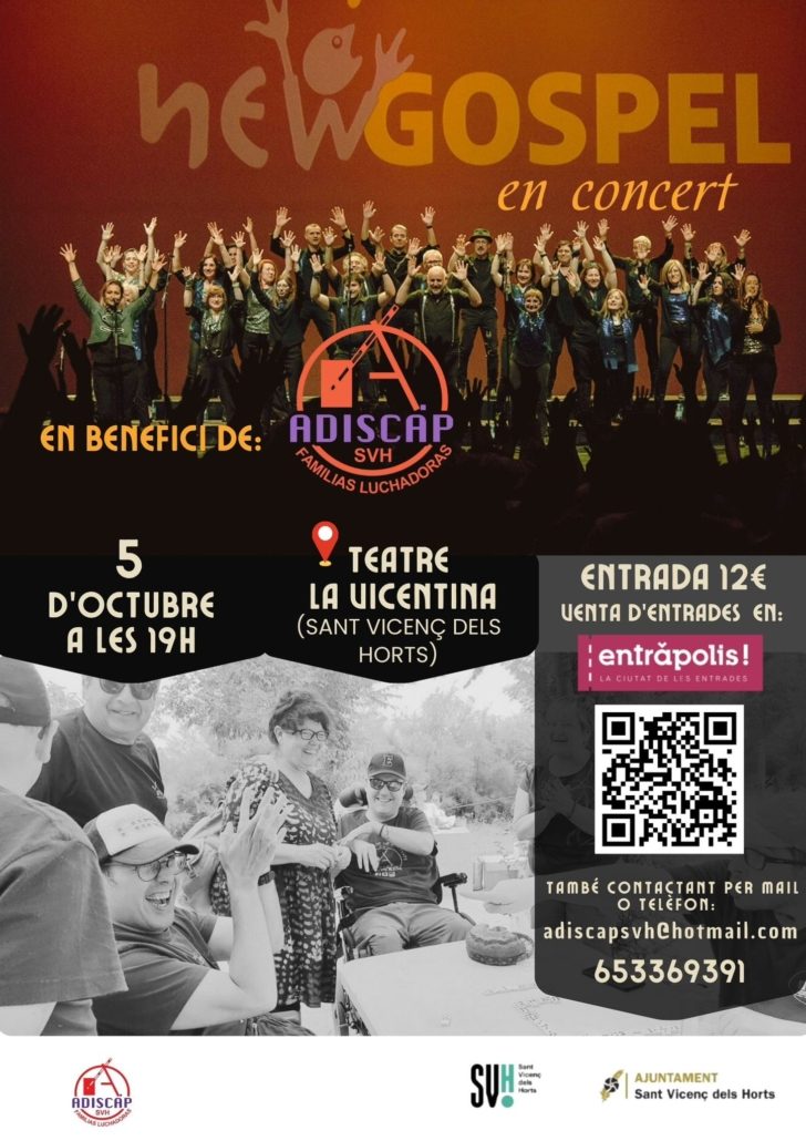 Aquest cop vam cantar al Teatre La Vicentina de Sant Vicenç dels Horts en Concert solidari a favor de l’ADISCAP, associació amb qui col·labora la PILI, companya contralt de New Gospel i qui els tenia una sorpresa preparada… cantar com a solista per ells!